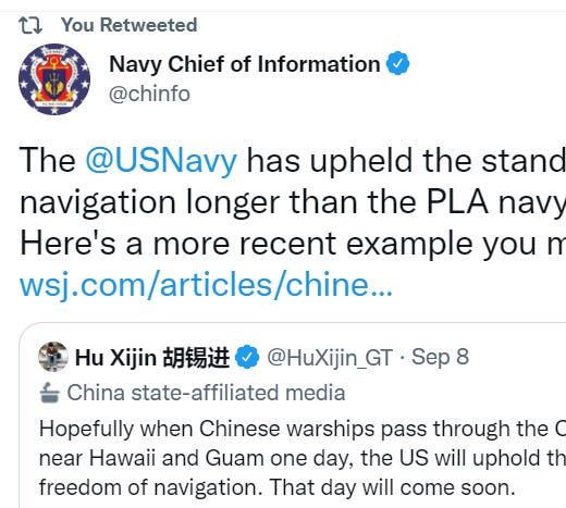 This is an incredible dunk by the U.S. Navy, but it also illustrates the difference in the kind of international institutions the two countries want to create.
