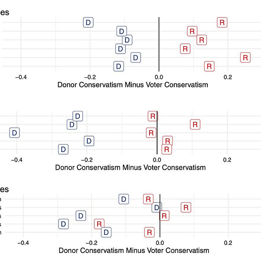 There are obviously important exceptions to this rule, but something a lot of people haven't updated on is that Democratic donors are more left-wing than rank-and-file Democratic Party voters, including on economic issues.