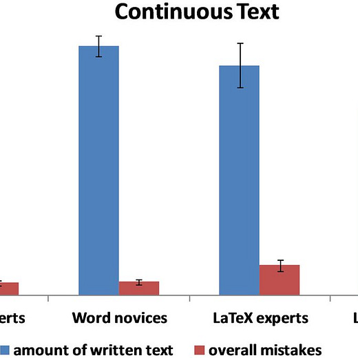 Sorry for bad news, economists: “our results suggest that LaTeX reduces the user’s productivity and results in more orthographical, grammatical, and formatting errors, more typos, and less written text than Microsoft Word over the same duration of time.” journals.plos.org/plosone/articl…