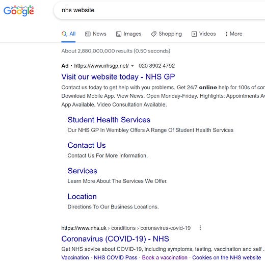 The top Google result (an ad) *looks* like the main NHS site, but is actually a GP trying to sign up online patients.