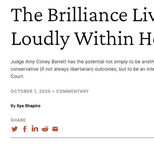 Ilya Shapiro on Sonia Sotomayor (17 years as a federal judge, extensive trial experience, pro bono and appellate work when she was nominated) vs. Amy Cony Barrett (3 years as a federal judge, never tried a case or argued an appeal, nominated after Trump promised a woman).