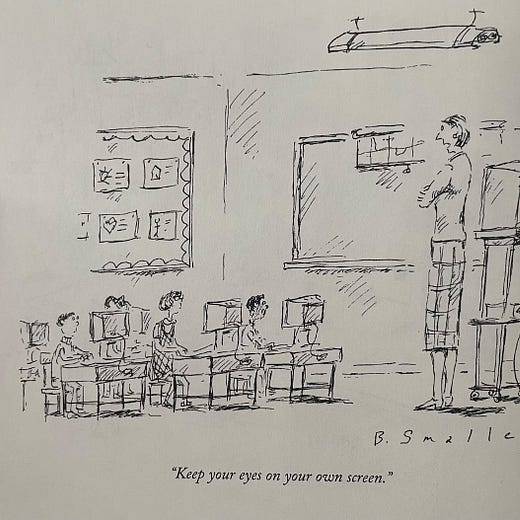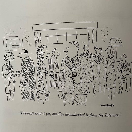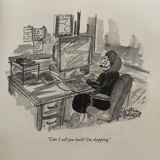 I love finding New Yorker cartoons so dated that the joke is lost entirely and the cartoons become just descriptions of people doing normal things.