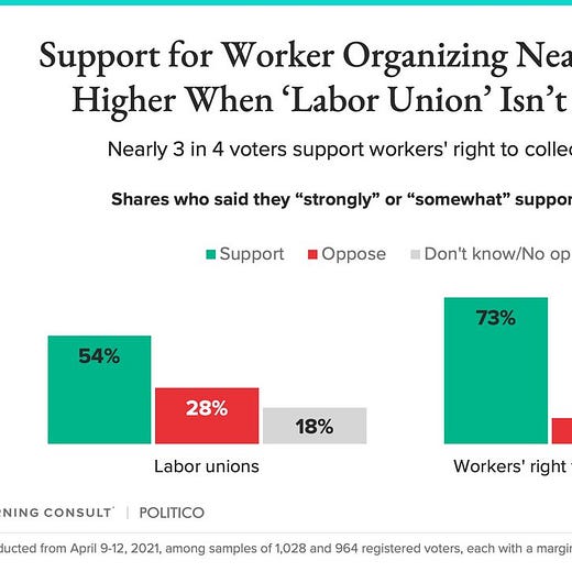 Labor unions poll pretty well, but the concept of collective bargaining without the term “labor union” polls even better.