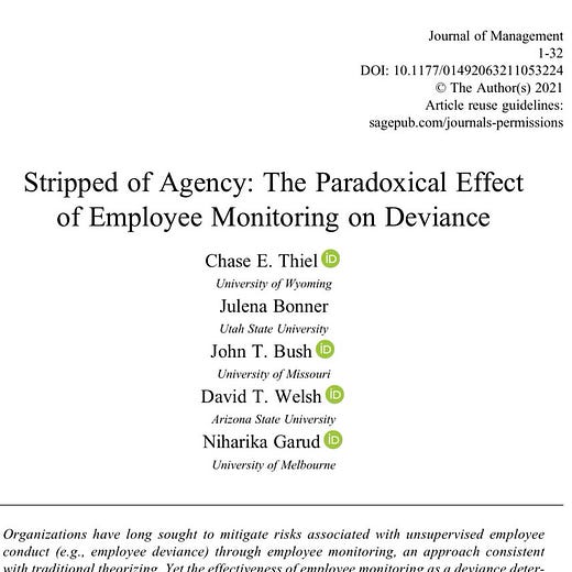 More & more companies are closely monitoring what their employees do. But this paper suggests that monitoring increases unethical behavior, at least when employees don’t believe they being treated fairly, because watched employees don’t feel agency & control over their actions.