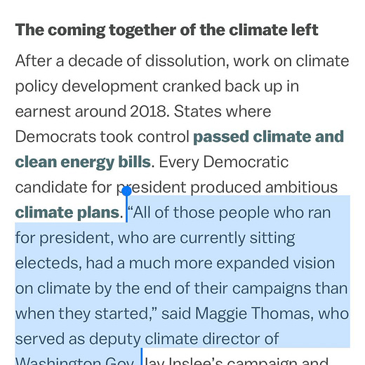 When you put progressives in a different more celebratory mood they are actually quite aware that Democrats moved left on policy in several areas. Here’s @drvolts himself on climate with an excellent piece describing “enormous change.”