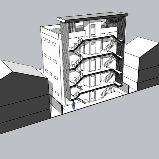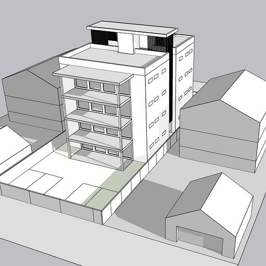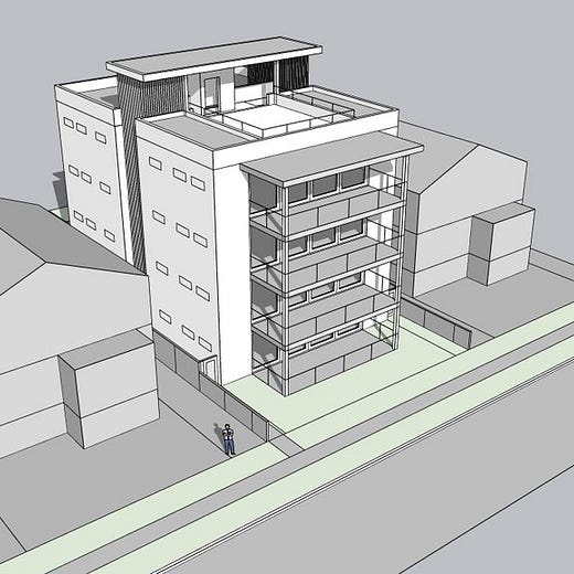 Still thinking a lot about how to do infill in existing single fam 'hoods. This is an accessible / passive house 8 plex that keeps the adjacent side yards, and is only 50% site coverage.