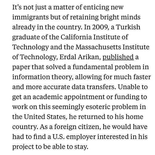 We blew our ability to lead in the development of and setting standards for the 5G technology… by not granting **ONE** Green Card.