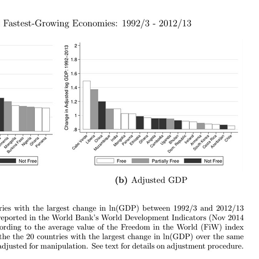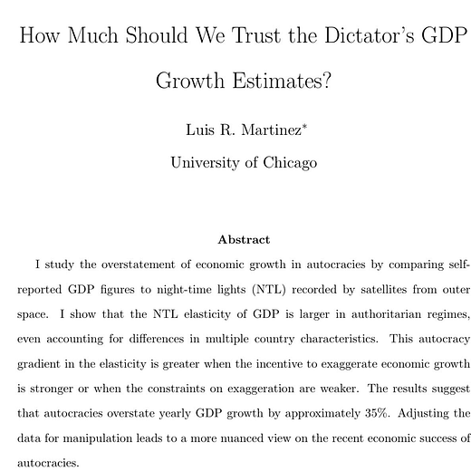 This paper compares growth in city lights to claims of economic growth, and it appears that autocratic regimes over-exaggerate yearly GDP growth by a huge 35%! (& the GDP gap between 🇮🇳 & 🇨🇳 is smaller than official estimates)