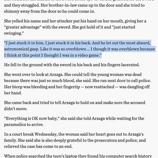 The full account of the Toronto woman who disarmed a sword-wielding murderer — an alleged woman-hating terrorist who wrote "Thot Slayer" on his weapon — and ended his attack on her workplace, is the most remarkable thing.