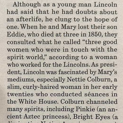 Like, Abraham Lincoln would literally invite a young woman to the WH to summon Aztec and Native American ghosts to give him and his wife emotional support and political advice.
