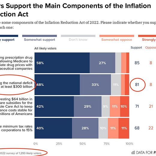 Notable here that one of the most popular parts of the Inflation Reduction Act — reducing the deficit, supported by 81% of voters in @DataProgress July survey of national voters — is the provision voters are most unaware of.