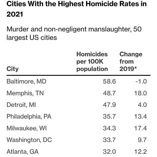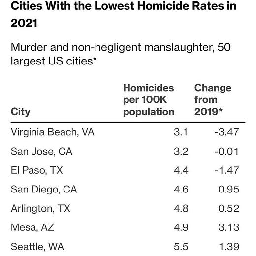 Here are the cities with the highest homicide rates and the cities with the lowest homicide rates.