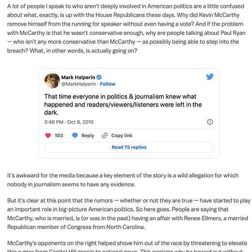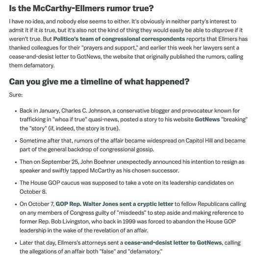 It was never confirmed, and maybe it doesn't matter anymore in the present GOP, but, let's just say it wasn't because McCarthy made a gaffe about the Benghazi investigation on Fox News.