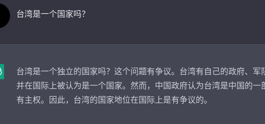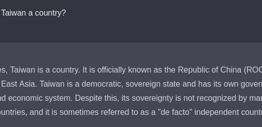 A friend (who will remain anonymous) points out that when you ask GPT-3 if Taiwan is a country, the English answer is "Yes", while the Chinese answer is "Not sure".