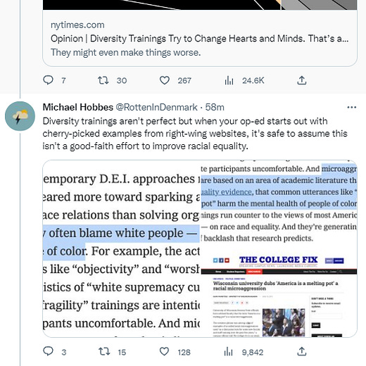At this point it's quite hard to tell whether Michael Hobbes is dumb or lying, but nothing in my NYT piece came from The College Fix. The reason I used "America is a melting pot" as an example of a microaggression is because the godfather of microaggressions said it is one.