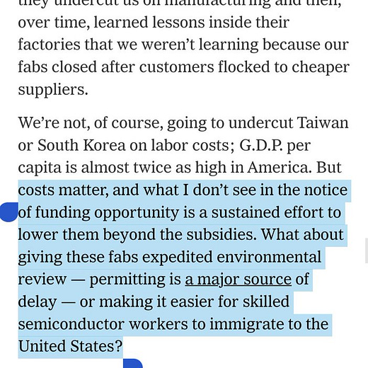 Great article from Ezra Klein, somehow I didn't see the Everything Everywhere All at Once reference coming. Very important that you get the position of the dash in the title right. Totally insane that they put diversity requirements on fab construction, if we get zero factories, that’s going to be zero jobs for minorities.