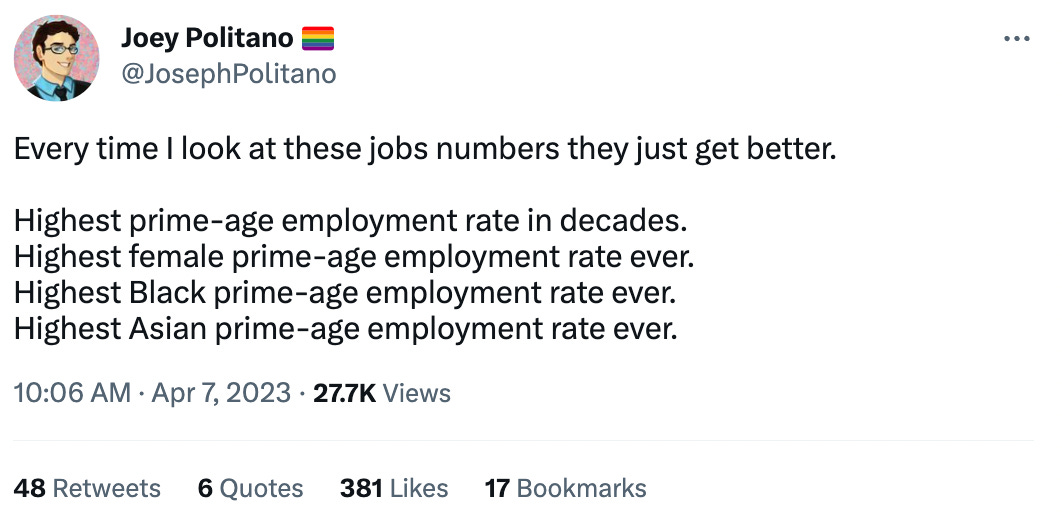 Jobs report looking really good. Apparently higher black employment ratio than white for the first time ever.