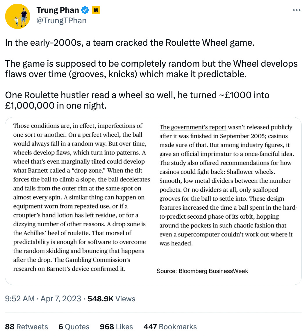 I like the line from the article, "To make money in roulette, all you need to do is rule out two numbers". There are apparently devices you can use to where the ball is likely to land once it's moving.