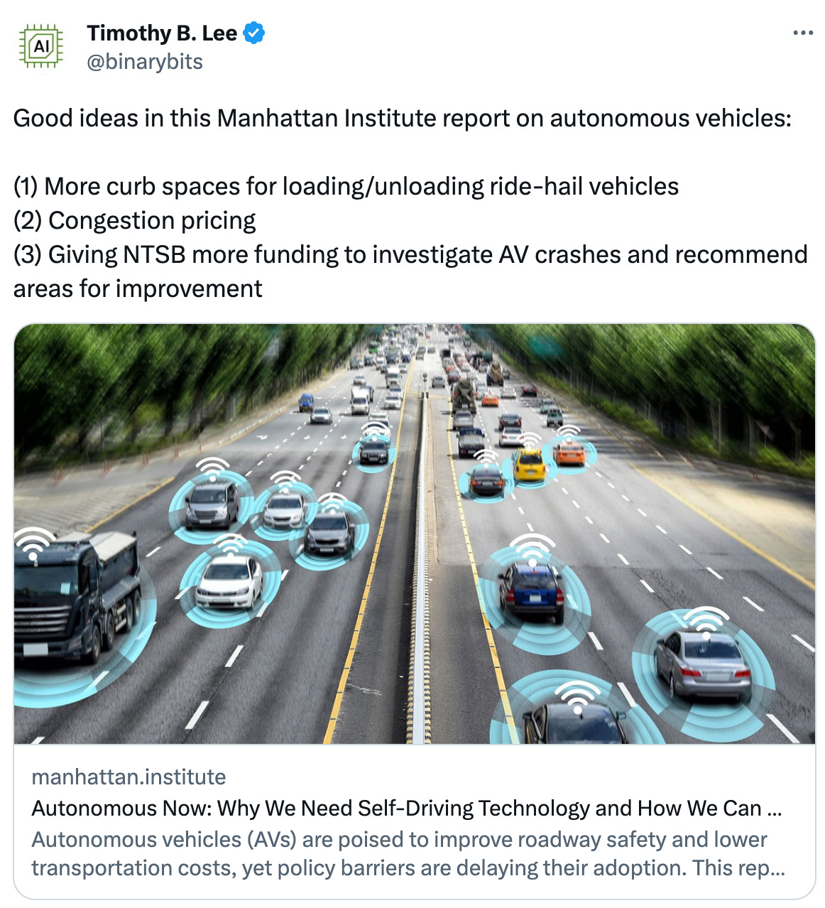 I think that self driving car adoption is a good opportunity to implement congestion pricing, perhaps starting just with autonomous vehicles, since they already can easily report their location at all times. Also, autonomous cars could pay for parking for extremely short periods without any transaction friction, so it’s a good opportunity to set that up as well.