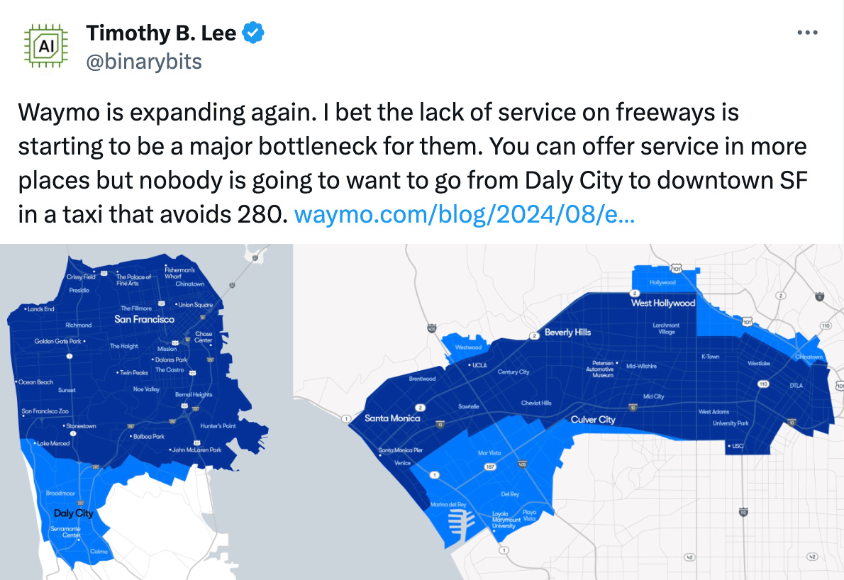 I believe they've previously been authorized to operate on freeways, they're just not doing it yet. A lot of bay area use cases for taxis require the freeway though. Oh, and someone got a video of the Waymo vehicle honking, which I had not seen before.