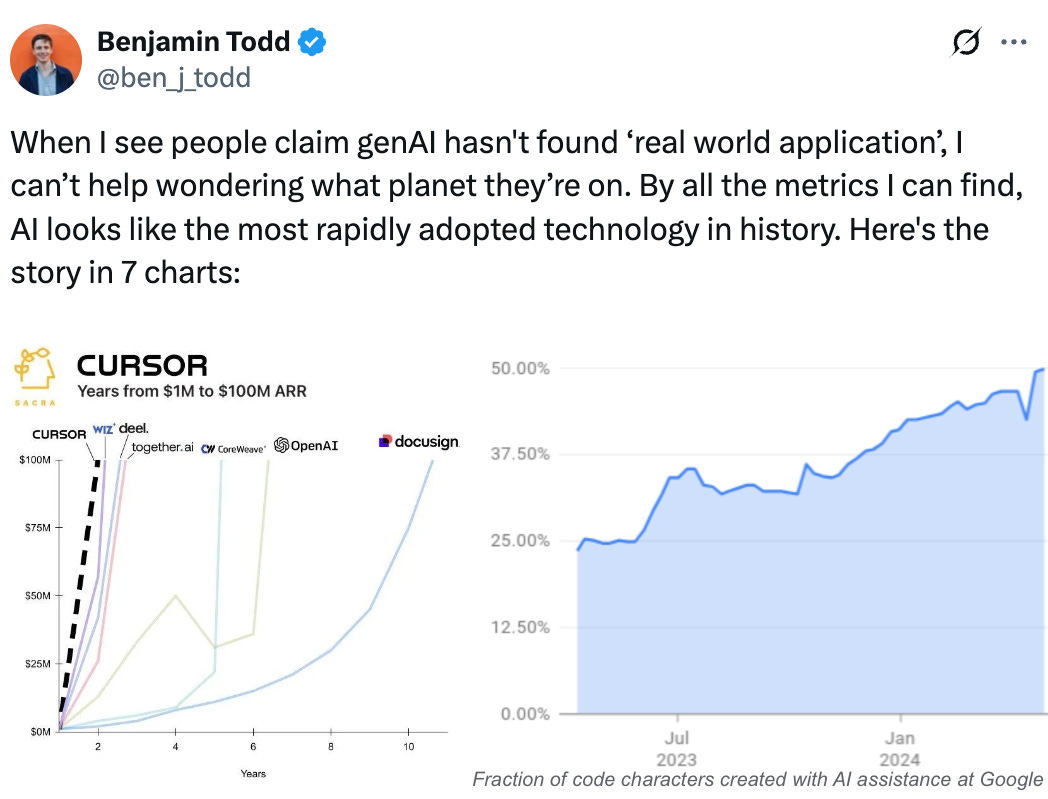 Check out the article for the other five graphs. Worth noting that the OpenAI revenue one is now out of date, they've now passed 12 billion annualized revenue. I recently skimmed a debate between Eric Newcomer and Ed Zitron, who wrote The Hater’s Guide To The AI Bubble. I think the revenue numbers are really quite important to the question about whether there's any value here, especially considering they're still doing it purely with subscriptions, which historically have been a relatively poor way to scale monetization on the internet. It's just very clear that as much as some people think AI is worthless, there are hundreds of millions of people who are using it regularly.