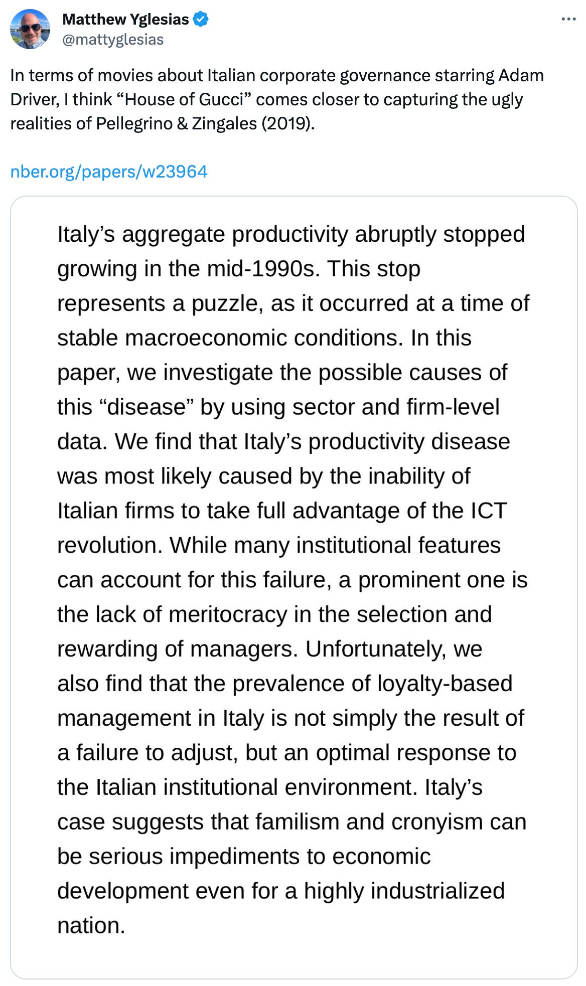 Here's the article he's linking about Italy's problems with productivity. In America the kids don't run the family firm, they fritter away the family money to ensure we don't have a permanently wealthy class. Amanda Orson looked up the old robber baron era wealthy families, they're mostly long gone. The most significant remaining wealthy family (Hearst) barred their progeny from taking over the family business.