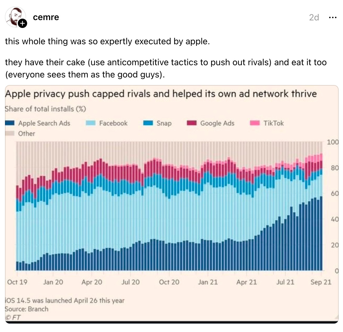 – Still insane that Apple decided to knock over the business model of all social apps while giving a massive advantage to their own ad platform. And they've so far entirely avoided repercussions. (src)