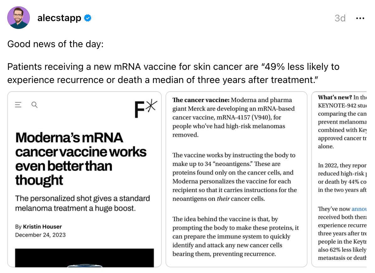 This is a personallized vaccine, they modify it so that it carries instructions your specific cancer cells. Very cool.