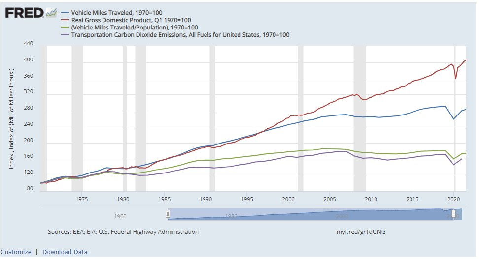 – It shouldn't be surprising, but VMT and GDP in the US have long since diverged, but also it's interesting that VMT per capita has flatlined (src)(cached)