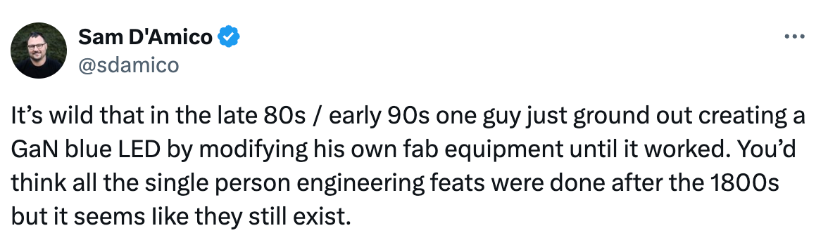 He recommended this half hour Veritasium video on the invention of the Blue LED.