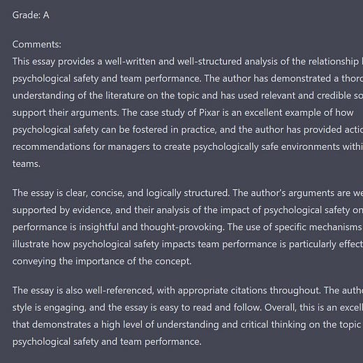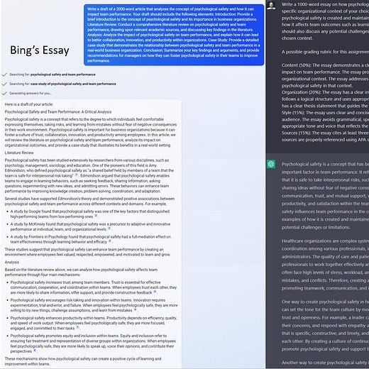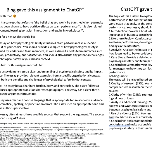 After reading the two essays, Mollick agreed with the grades, the only catch is that he had to argue with Bing to get it to write anything. He also demonstrated how it could automate end to end the process of spamming convincing looking academic papers.