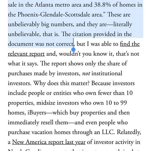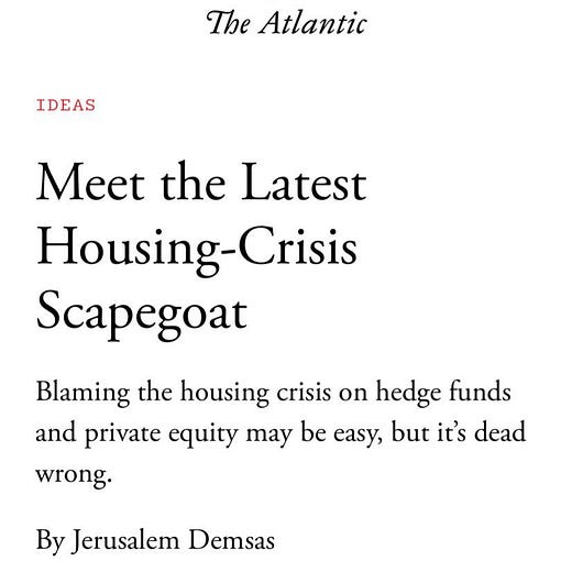 I'm certainly not wild about institutional investors buying tons of homes up to rent out, but it's also an absolutely miniscule part of the total housing stock. Here's the full article. I don't know the scale of the problem, but landlords using software to automate collusion on rent increases seems like a more serious problem.