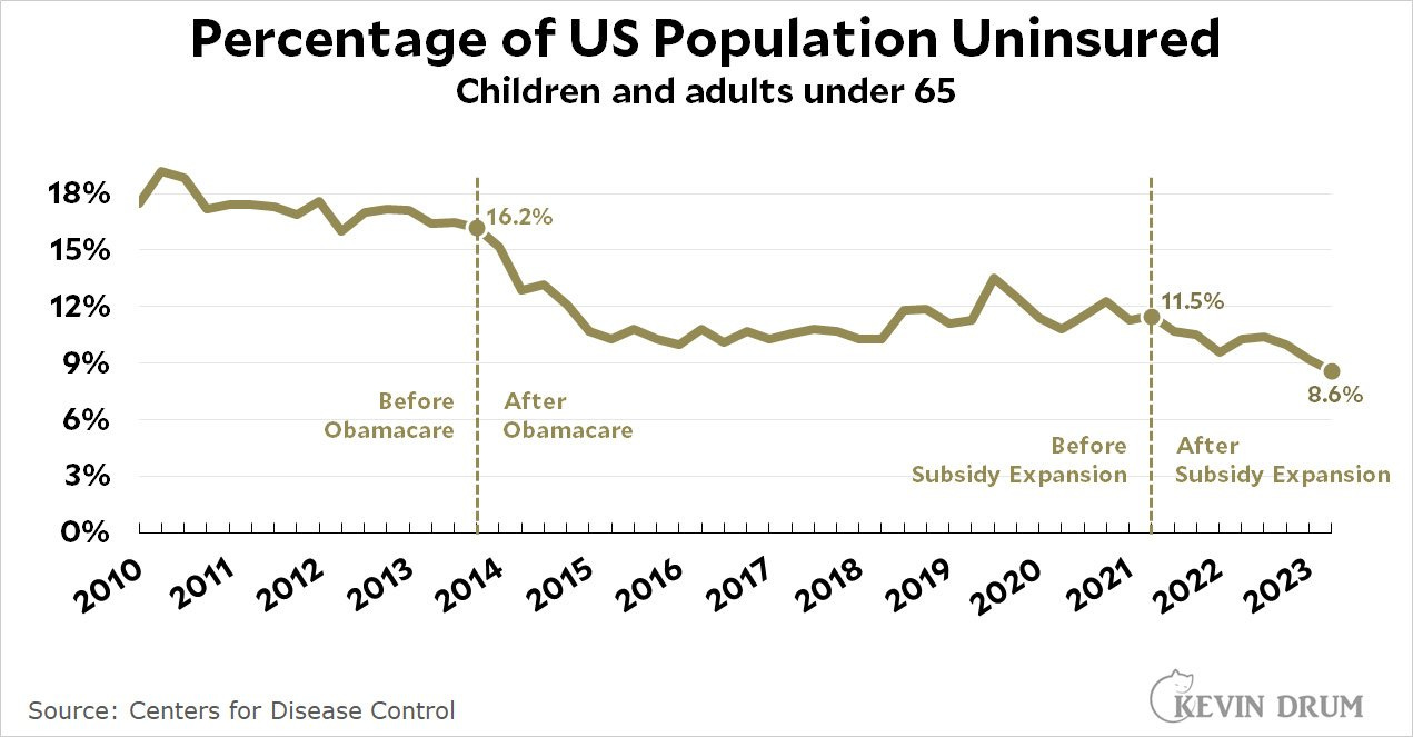 โ Thanks to the American Rescue Plan signed in 2021 by Biden, uninsurance has reached its lowest level in US history. (src)(cached)