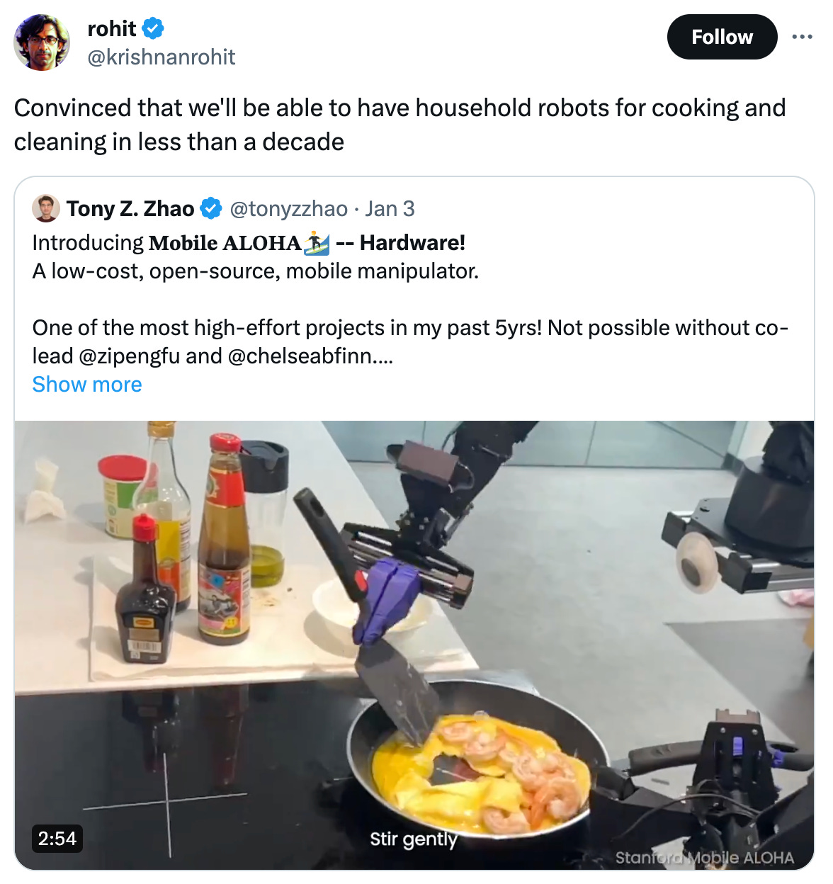I suspect this kind of household robot is still a bit far off, but the way they trained this one is really interesting. They have a rig that can be set up with it so that a person can operate it like a mech to train it on what the task is supposed to look like. They found this kind of training was more effective than expected. Also impressive: they put this thing togther for $20k. It's just a laptop with a mobile 3070ti. Also check out the video of it making horrible mistakes.