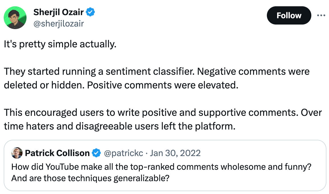 The standard for youtube has always been to never read the comments, now that he mentions it, they really seem better now. In a follow-up he mentions the downside, now most of the comments are people saying they love the video.