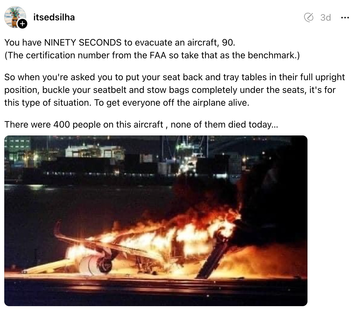 I had not realized that the standard is 90 seconds, but what I have read in the past is that the biggest danger is suffocation, especially because jet fuel fumes are pretty toxic.