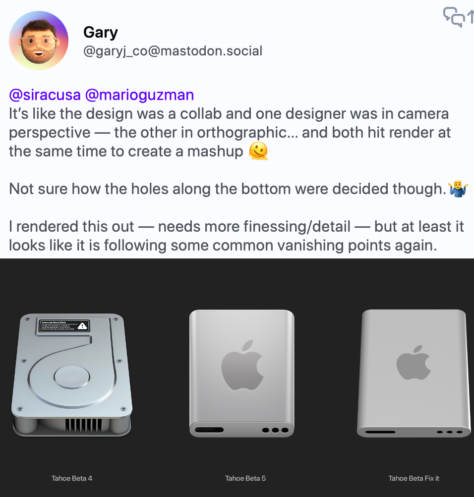 Just... absolutely ridiculous situation around Apple's new drive icons. What were they thinking. There is no vanishing point. The angle on the front doesn't make sense. If you actually tilted a drive like that, the front would look totally different. If you can't tell what's going on in the picture, the leftmost is what it used to look like, the middle is the beta, and the rightmost is this designer's proposal of what it should look like.
