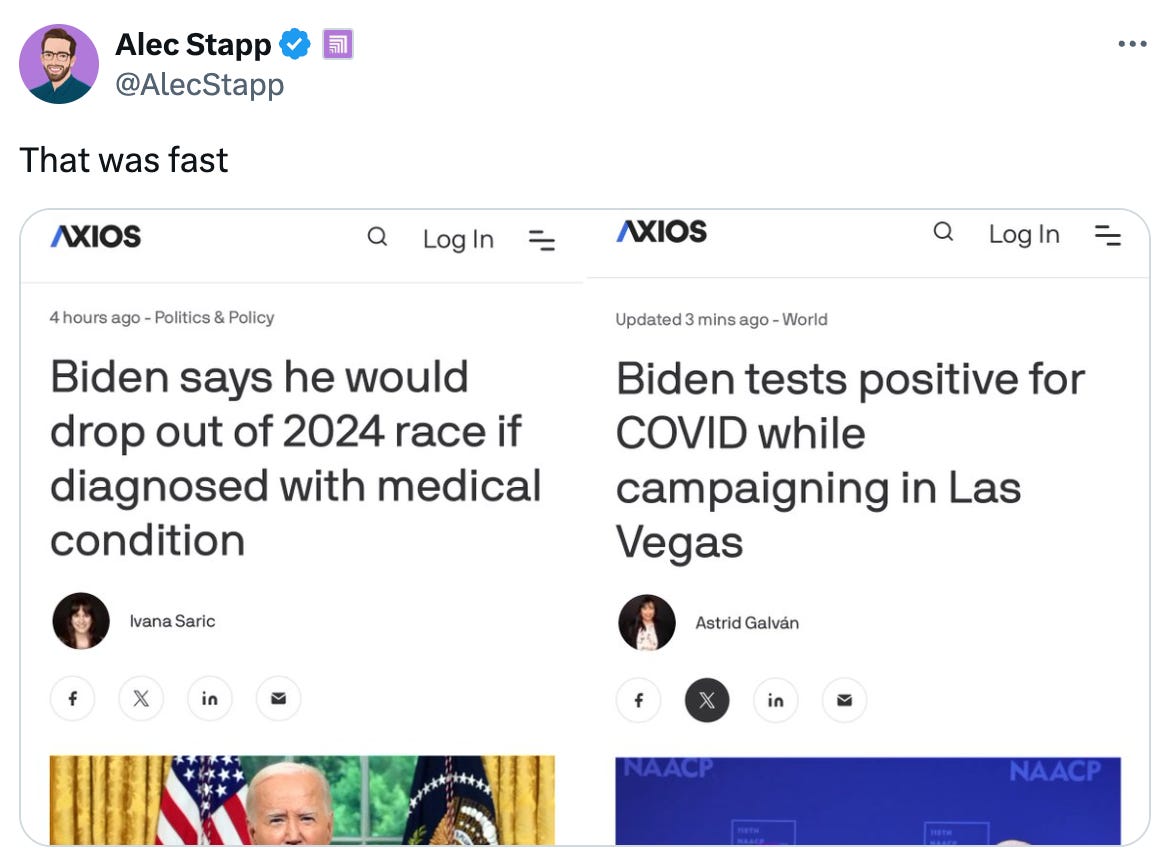 On this sequence of events, the likelyhood of Biden dropping out jumped to over 60%. What's more, Schumer's office leaked that they told Biden to withdraw on Saturday, Jeffries too. Pelosi has also been rumored to be working hard behind the scenes to get Biden to withdraw. If you're looking for another argument on why Biden should withdraw, here's one paraphrasing Eric Levitz: imagine Trump was trailing Biden in the polls and he voluntarily stepped down as nominee, as a Democrat, would you think it makes the Republicans more or less likely to win?