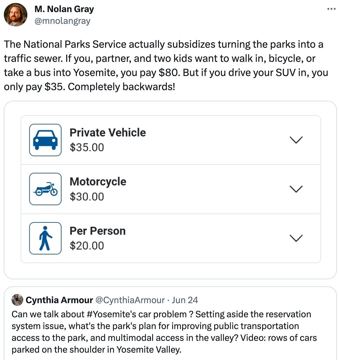 This pricing might almost make sense if you had to pay both $35 for the car and $20 for each person in the car. But in any case, it reads like someone just randomly came up with these price points without any serious consideration. Check out the linked video to see the predictable outcome of this policy choice.