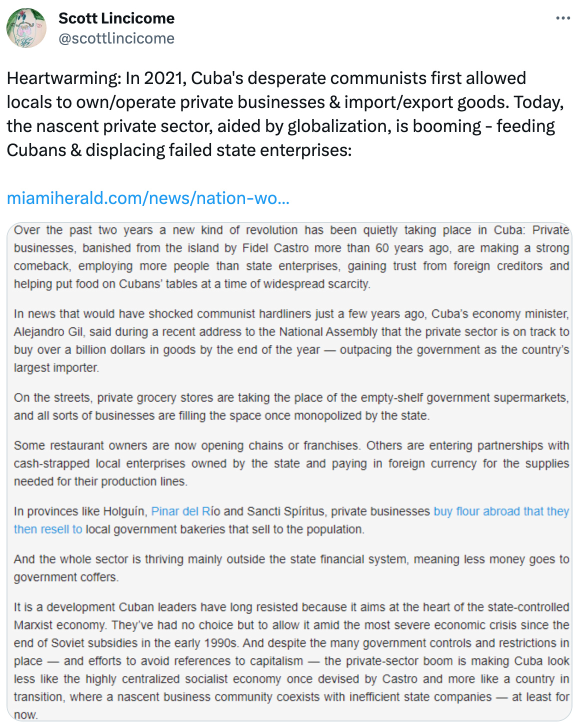 Cuba has allowed way more private businesses, and it appears to be working, there are now more private-sector workers than government ones.