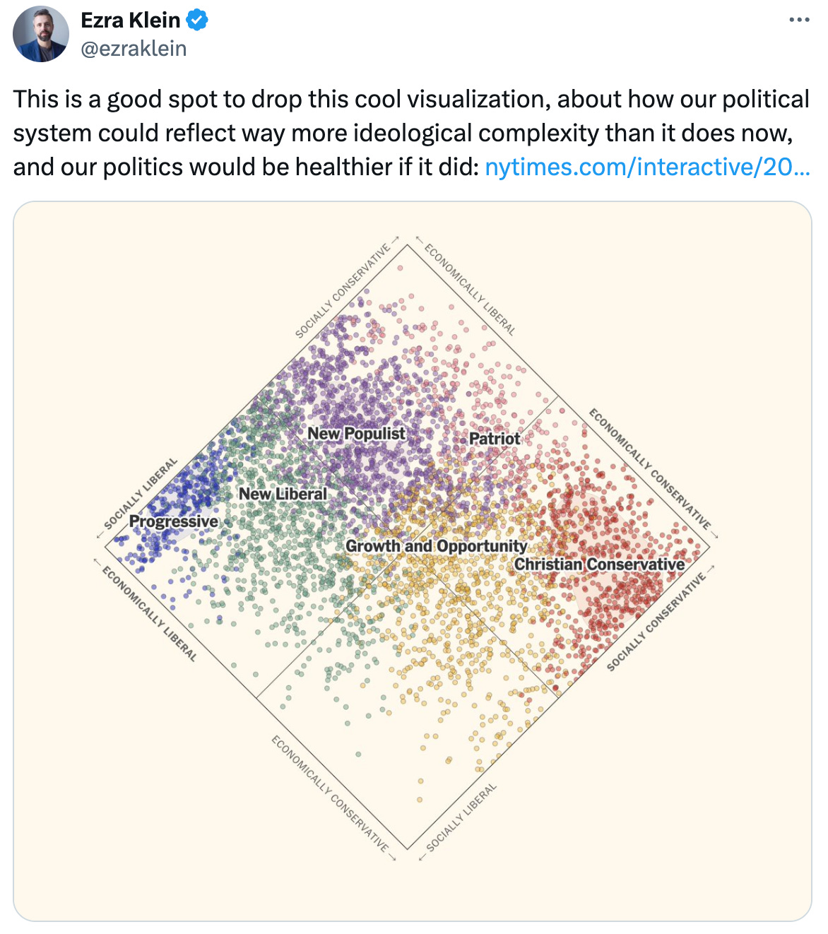 Cool to see more specific groupings overlaid on a political compass, I really want to get around to building a political compass quiz that requires you to rank order your priorities, but I haven’t gotten around to it yet.