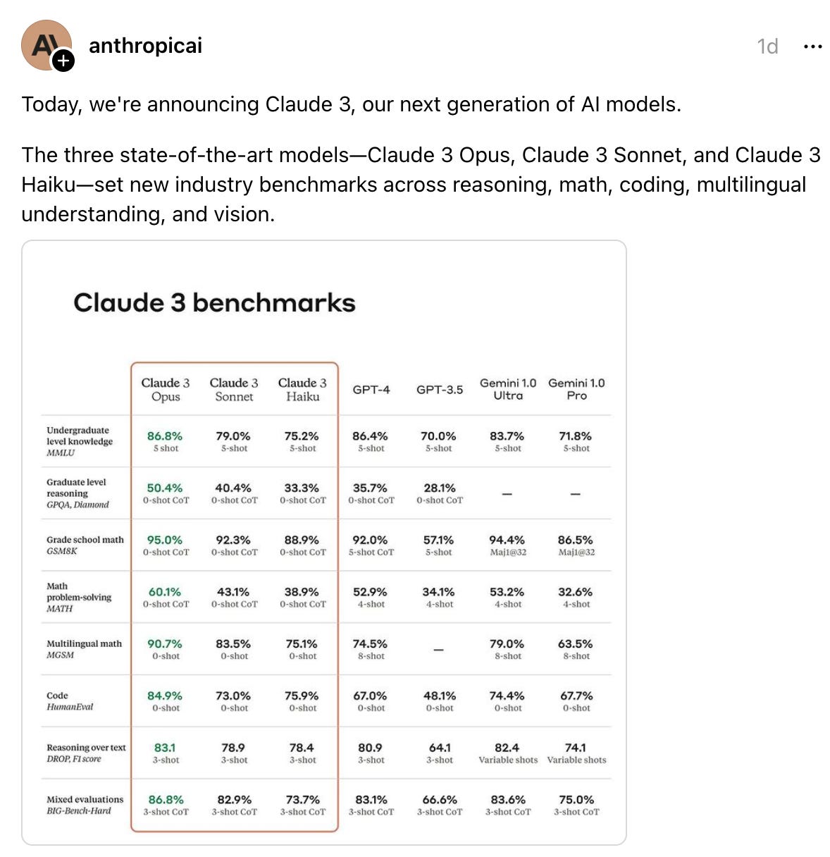 Seems like very good performance, but of course third party testing is probably better. Interestingly, during needle in a haystack testing of the new Claude 3 model, the model pointed out that it's probably being tested. Best guess is that there's actually some info about haystack testing in the training data.