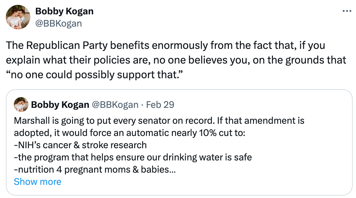 – Speaker Johnson tries to claim he supports IVF, despite the fact he cosponsored a bill that effectively would have banned it a year ago. (src)(cached)