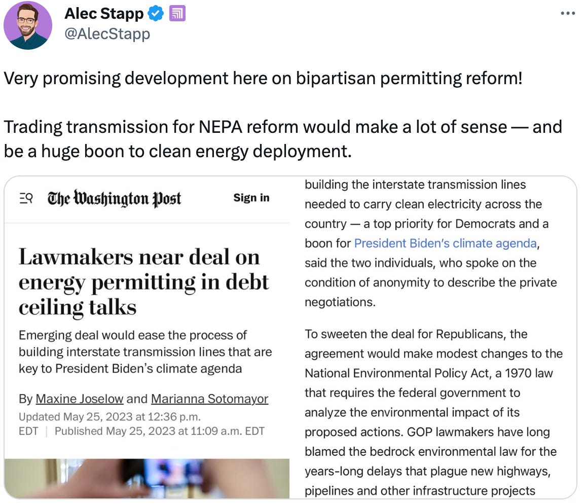 If we do get a debt limit increase, maybe it can come with some good stuff attached! Other reporting indicates that permitting reform is likely to not fully make it in, unfortunately less funding for the IRS is also under discussion. The real question is whether a deal will happen at all, and the question there is basically one of "the competence and reasonableness of Speaker McCarthy"