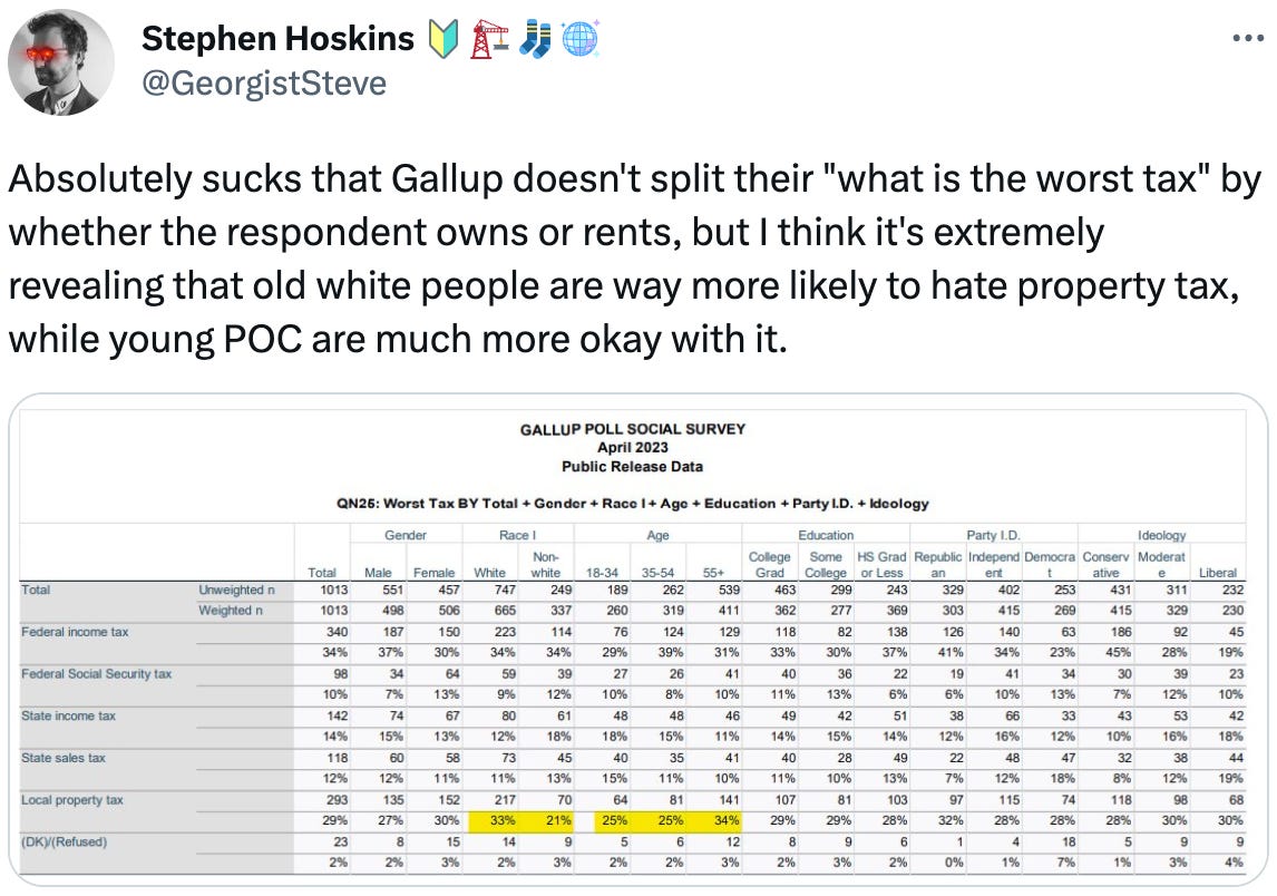 Asking landowners whether they like their land being taxed is silly. As much as LVT is better than a standard property tax, both are better than income taxes. Arguments that people have a deep personal connection to their land are also bogus.