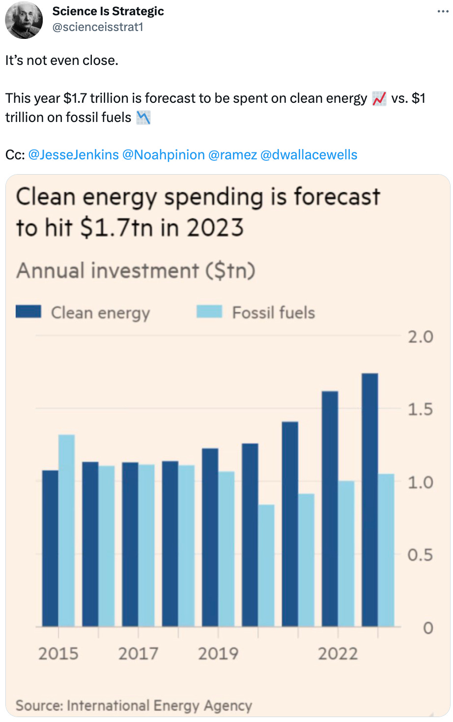 The headline of the associated FT article is that solar investment now exceeds oil investment globally. Here's the graph from the IEA report.