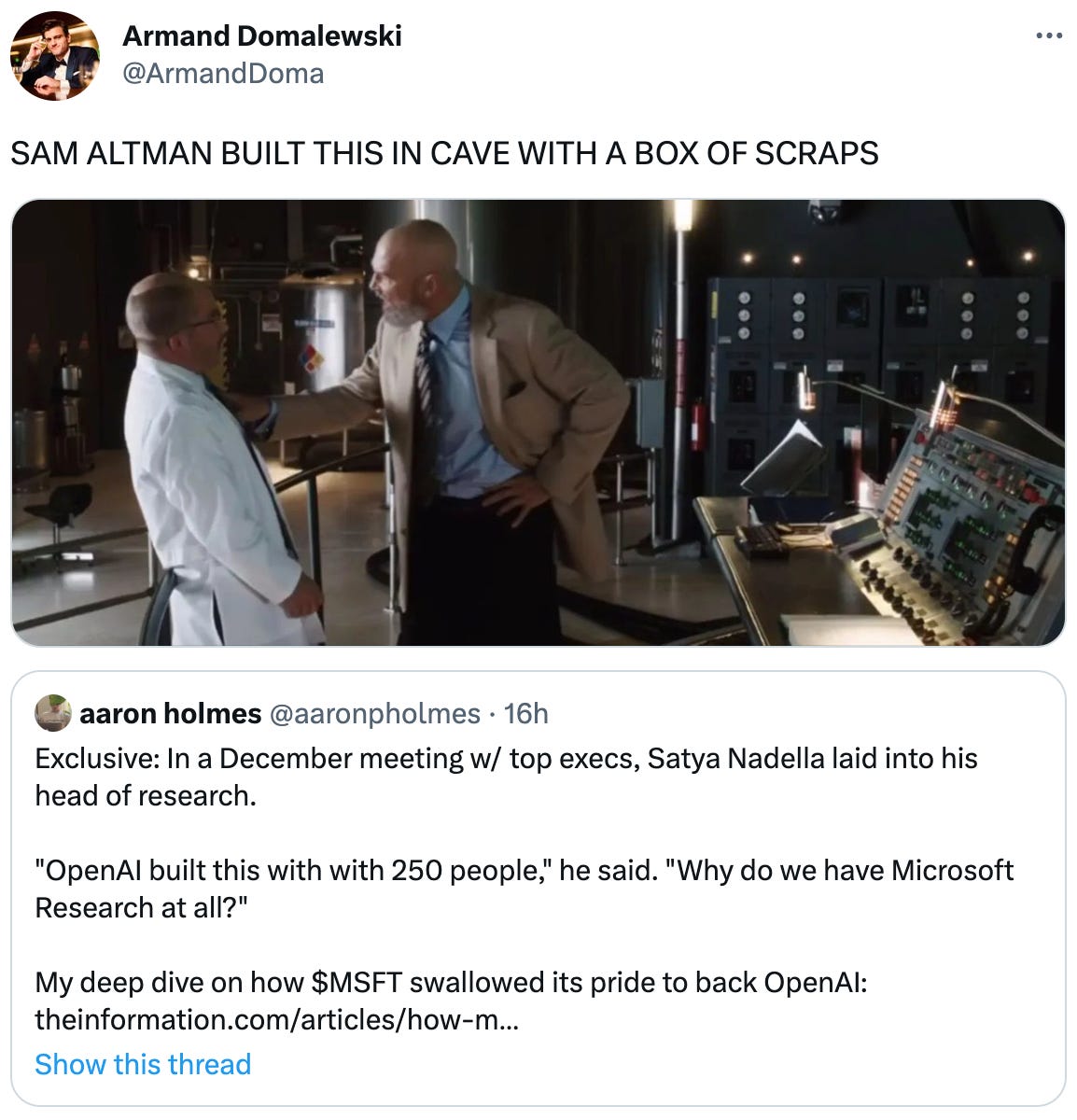 Good that Nadella chose to pay Altman for access to GPT4 rather than incapacitating him and tearing it GPT4 out of his chest as Stane does a few scenes later.