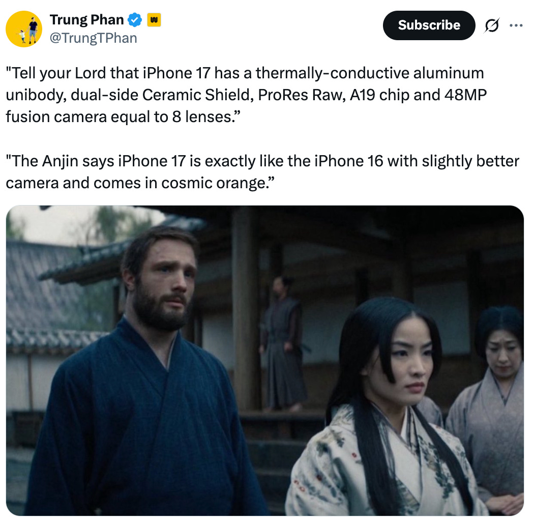 If you’re wondering, the meme is from Shōgun, and Marino’s translations always cut to the heart of the matter. To be fair (cached), the new AirPods can act as a universal translator, so that’s cool.