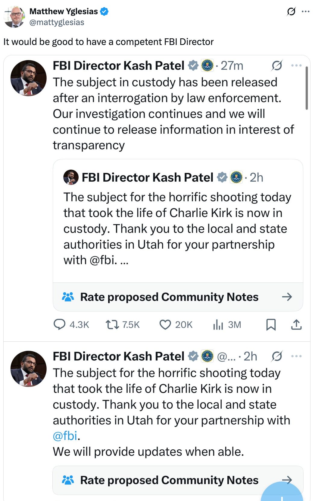 – If there weren't enough problems at the FBI, this lawsuit by two fired agents alleging they were fired for not saying who they voted for in 2024 seems extremely bad. (src)(cached)