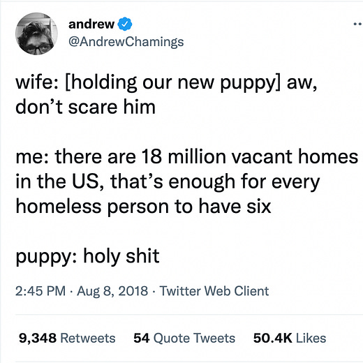 Check out the thread for individual details, but the one I'd like to highlight is that the vacant homes aren't in the same place as the homeless people. Places with vacant homes generally don't have as significant a homelessness problem.